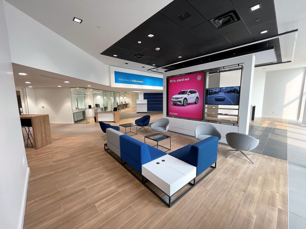 Peter Schwabe, Inc. is completing the finishing touches on this beautiful Volkswagen auto dealership remodel! This project included the extensive remodel and expansion of an existing VW dealership in Glendale, Wisconsin. The new space features a fully updated showroom and additional offices to handle increased traffic. Additionally, the Service Center reception area received a full update with new lighting, ceiling, flooring and furniture. Peter Schwabe, Inc. was able to run this project as a live remodel with very minimal disruption to current operations.